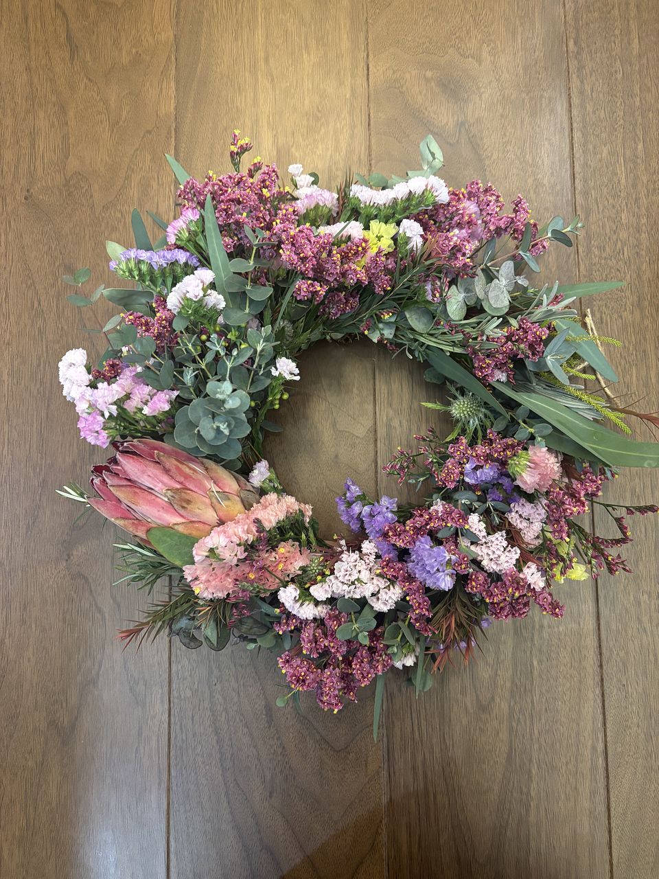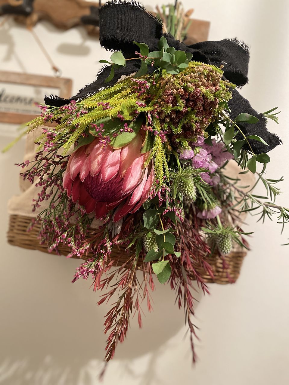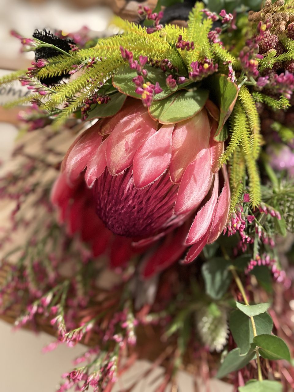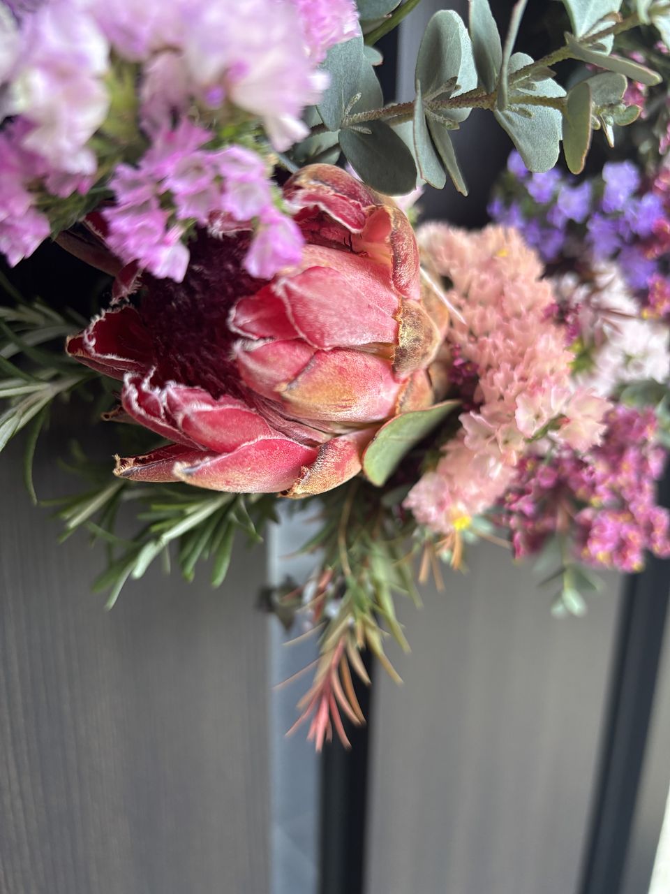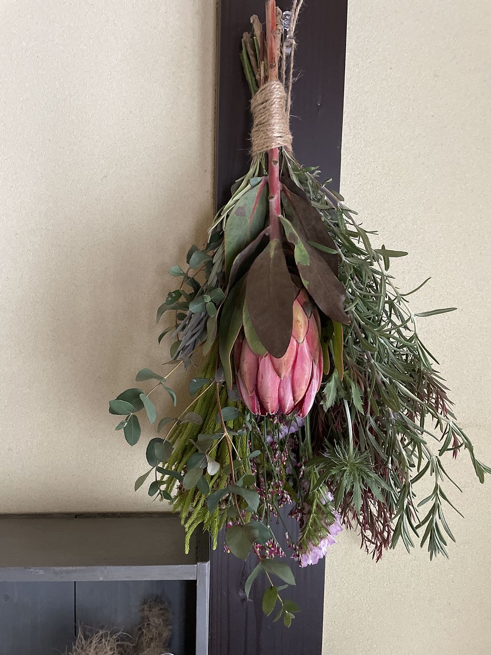 プロテア、ローズマリー、ユーカリの香りがとても良く清々しくスッキリして和みます。 スターチスとユーカリを足してリースにしました。思ったよりプロテアが主張しすぎず馴染んでとても素敵に出来ました💓