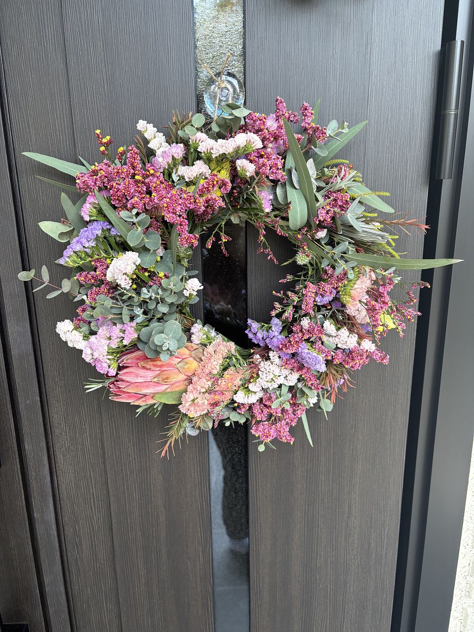 春用スワッグが作りたくて探してたところ プロテアが目につき購入。 予想以上にいろいろな花材が入っていて、 配置悩みましたー。 まだ寒い日が続きますが、玄関は華やかに 春感じてます