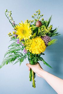 珍しいレモン色の芍薬「オリエンタルゴールド」が入ったイエロー×パープルカラーのブーケは今だけの組み合わせ🍋🍇