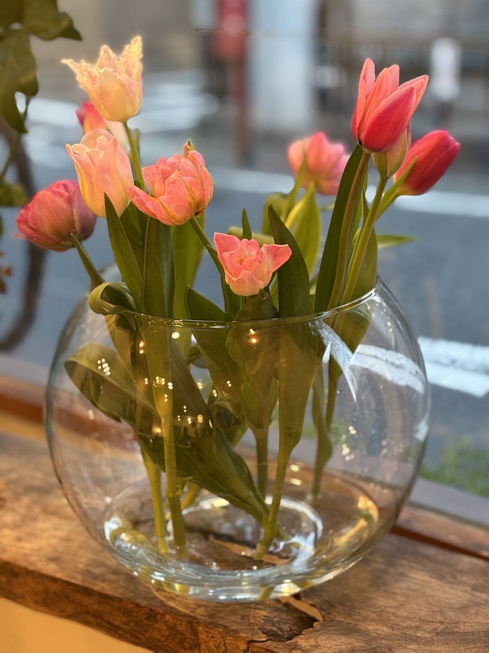 一重咲き、八重咲き、パーロット咲き、クラウン咲き。表情のちがうピンクのチューリップを、ぎゅっと10本集めました🌷