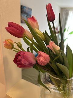 バラエティーに富んだ色、形のピンクのチューリップで、とても可愛いです。 2月にしては春本番のような陽気になり、届いた時には花が開いていました。蕾からの変化を楽しむことができず少し残念です。