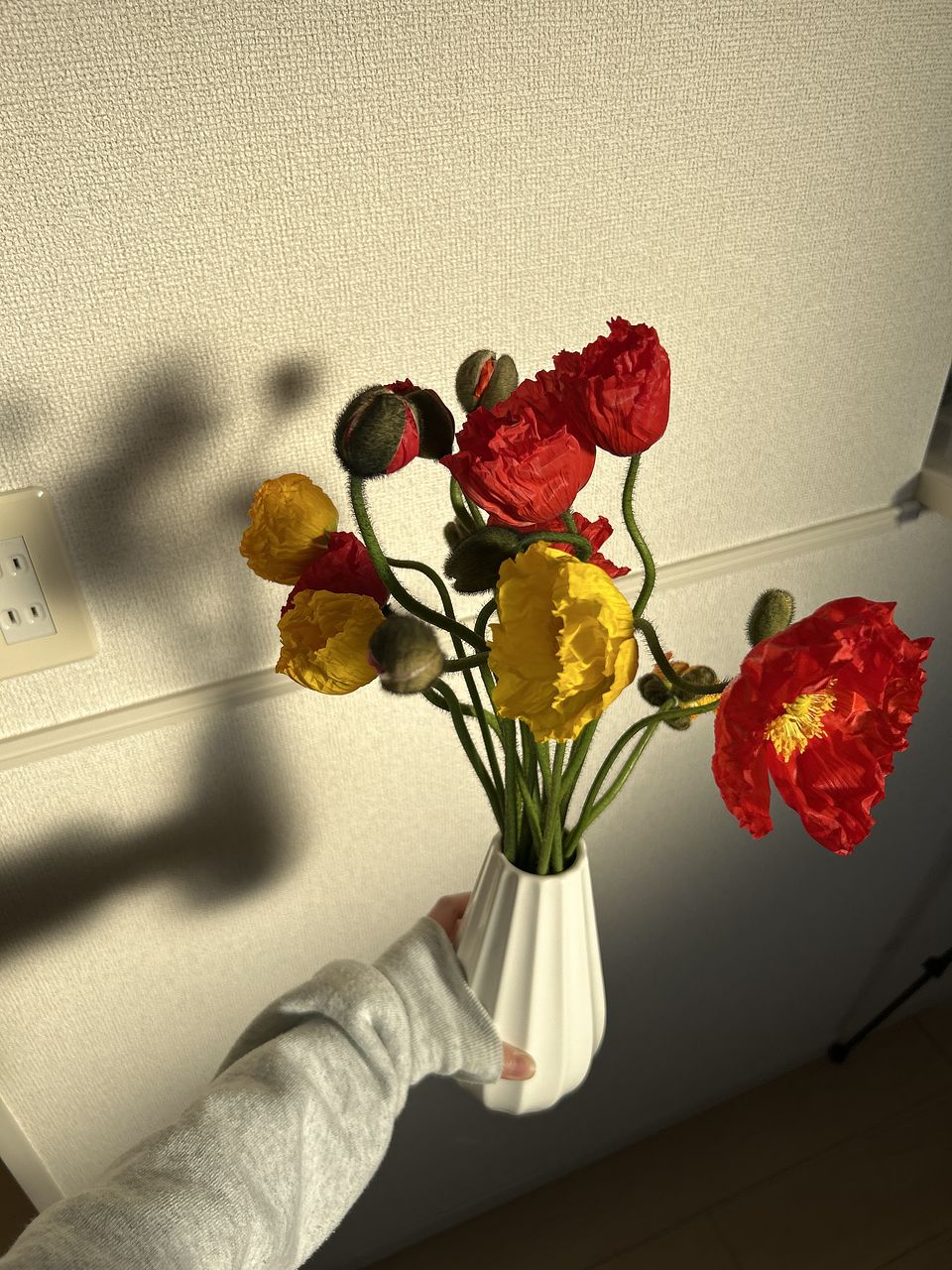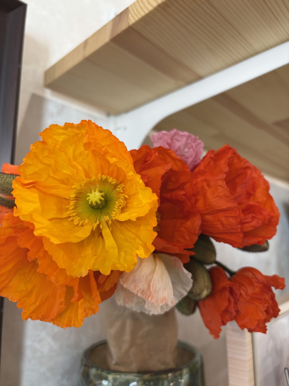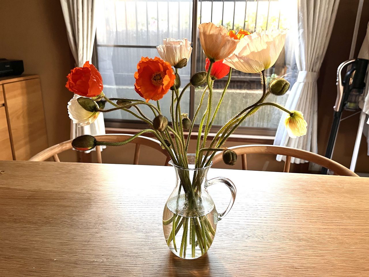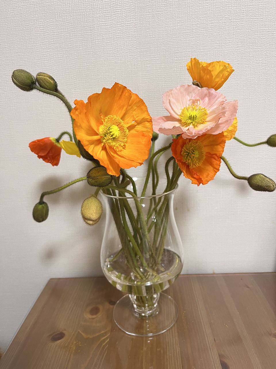 2回目のポピーです。 前回うつむいたつぼみが花開いた重さで3本ダメになってしまったので、今回は紙で巻いて水揚げしたらまっすぐに🌼 玄関を明るくしてくれる花たちです✨