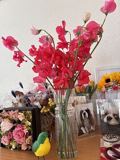 とても、可愛いい 赤いスイートピー今、フラワーベースを 悩み中です。これも楽しい時間
