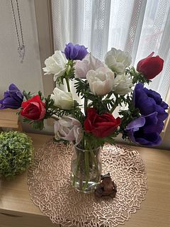 新鮮な大輪のアネモネ、とても立派でした。あっという間に花が開きましたが丁寧にお世話をして長く楽しめたらいいなと思います。