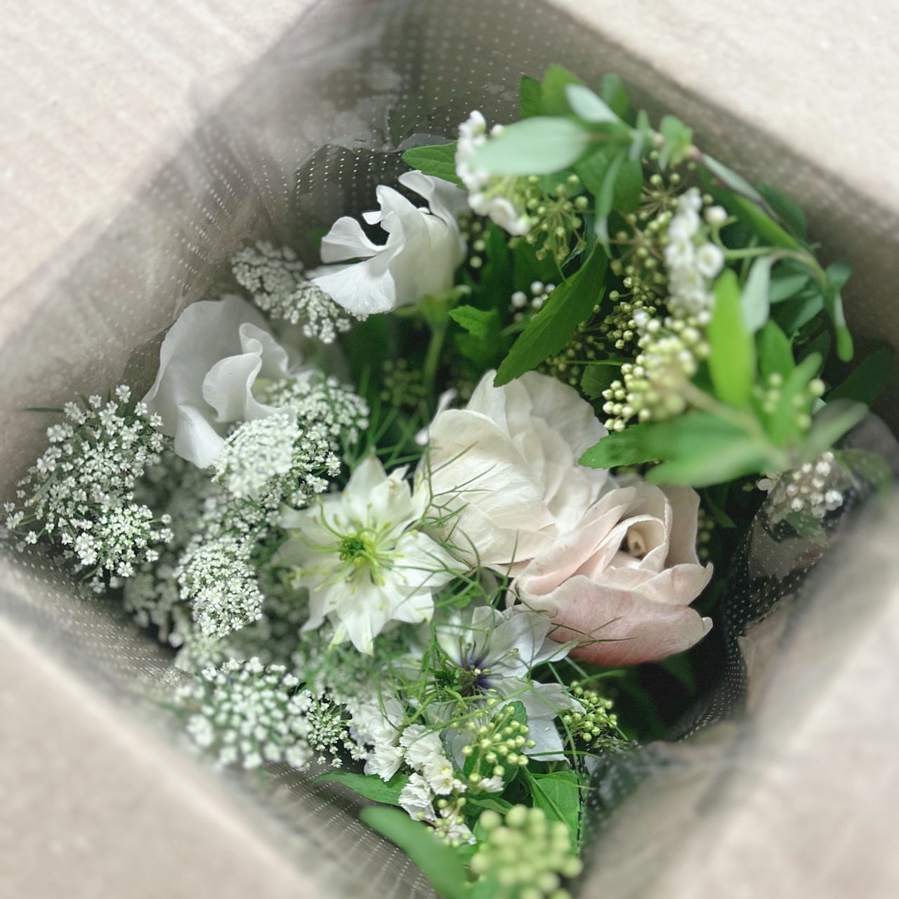 ふんわりと風が吹いているような、春のお花をナチュラルカラーで束ねて🕊️🌿白いアネモネの花言葉は、「真実」「希望」「期待」🤍