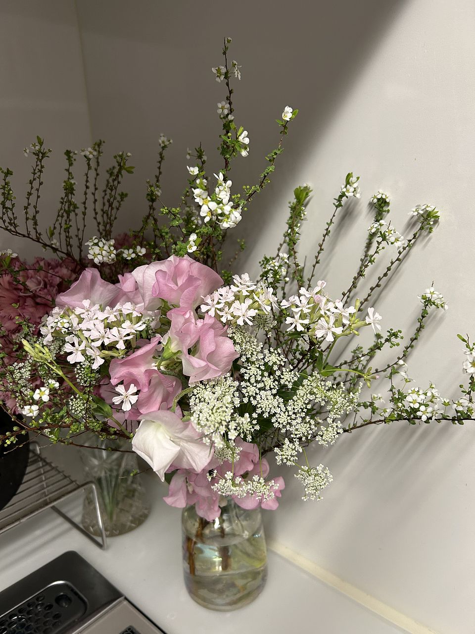 まるで桜吹雪🌬️🌸動きのある雪柳と淡いピンク色のスイートピーをかわいく合わせました。雪柳は蕾の状態から少しづつ白い小さな花を咲かせます🤍
