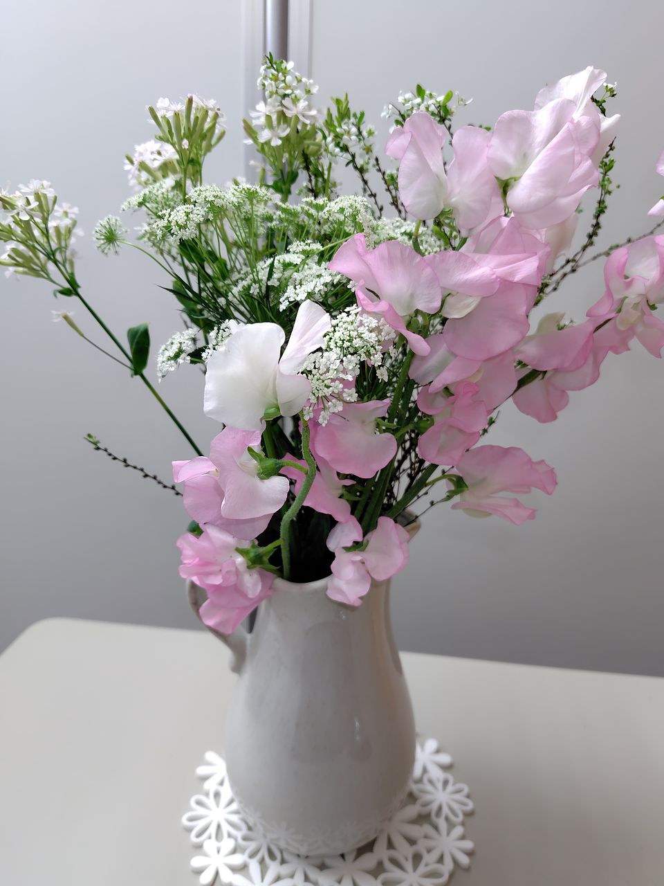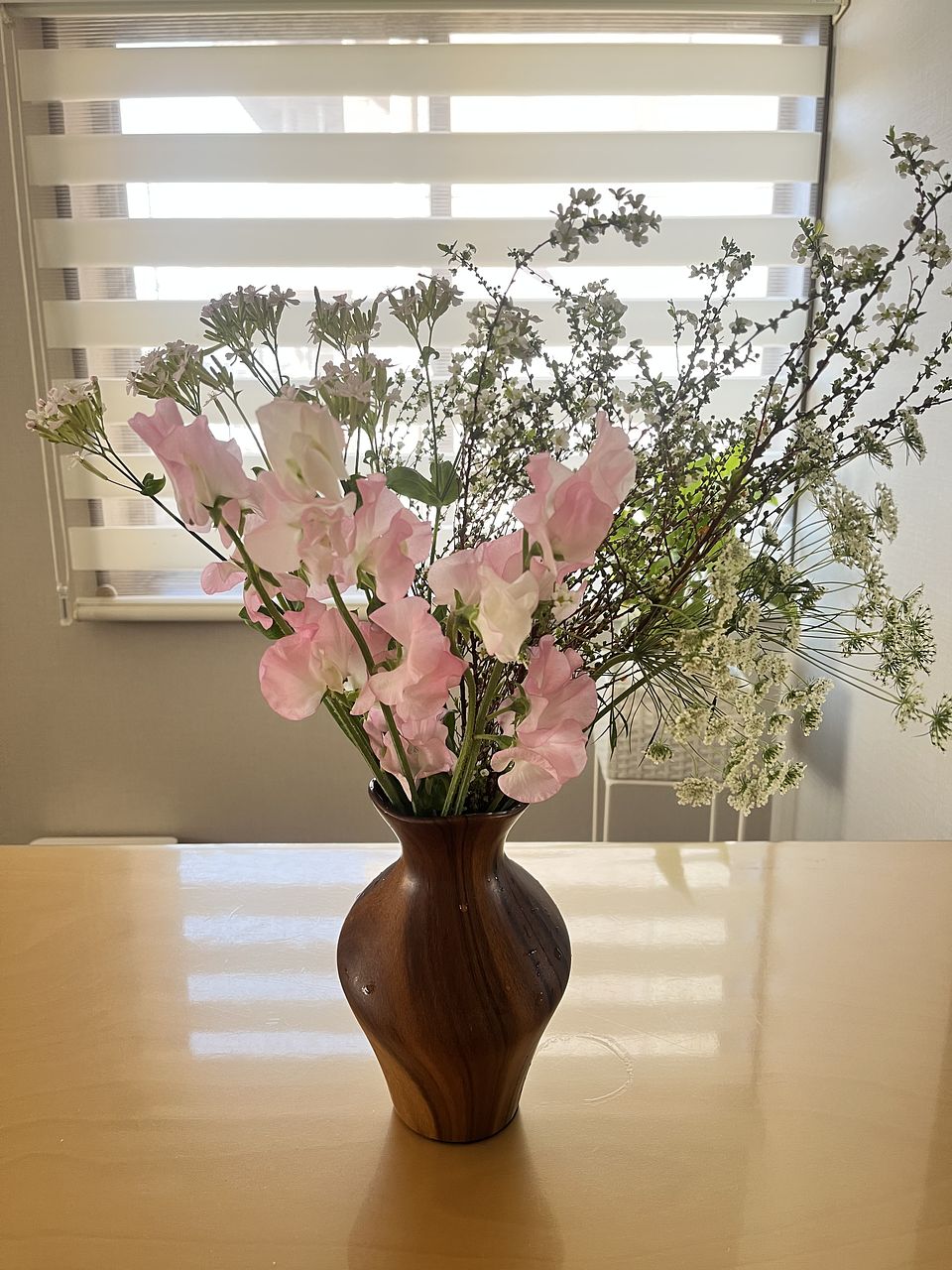 スイートピーの香りに癒されます😊 雪柳の丈が短く少し残念でした
