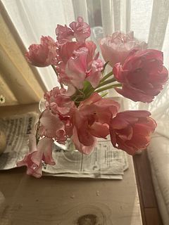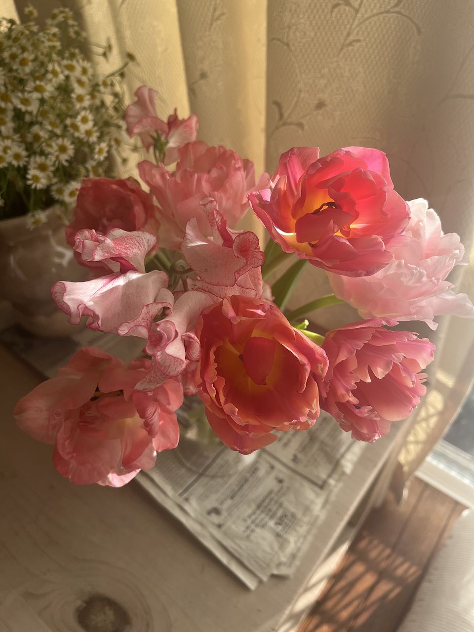 多幸感あふれるチューリップ「ラルゴピンク」と珍しい芍薬咲きの「タイワン」。