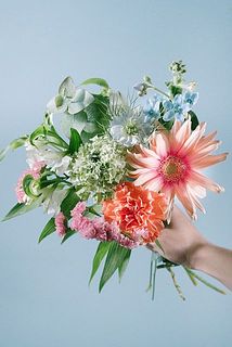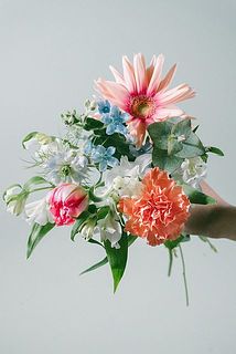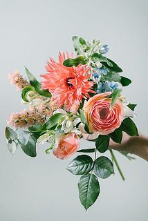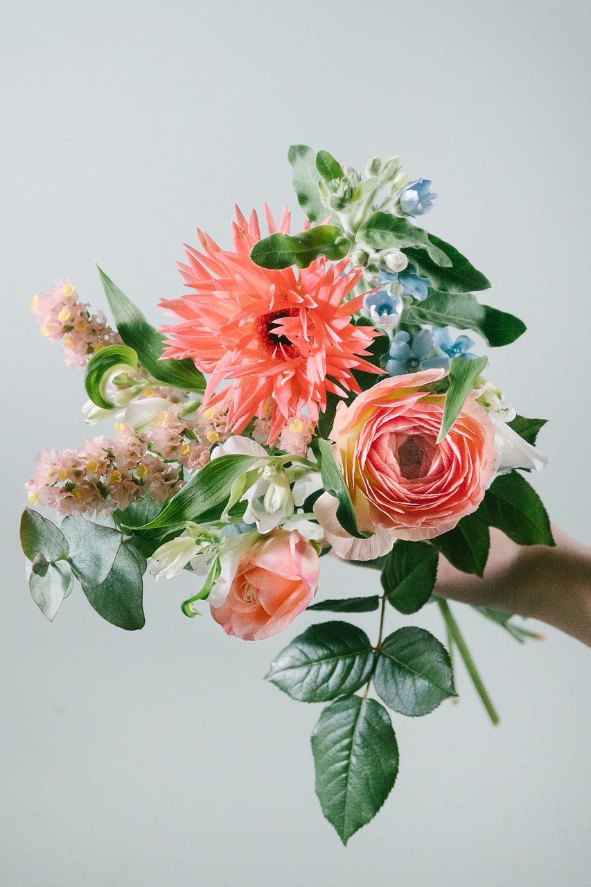 創造性にエネルギーを与えられる魚座のパワーカラーと、海にまつわるコーラルカラーの花々と組み合わせたブーケ。