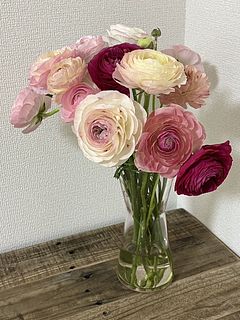 濃淡のバラエティ豊かなピンクのラナンキュラスをたっぷり束ねて。