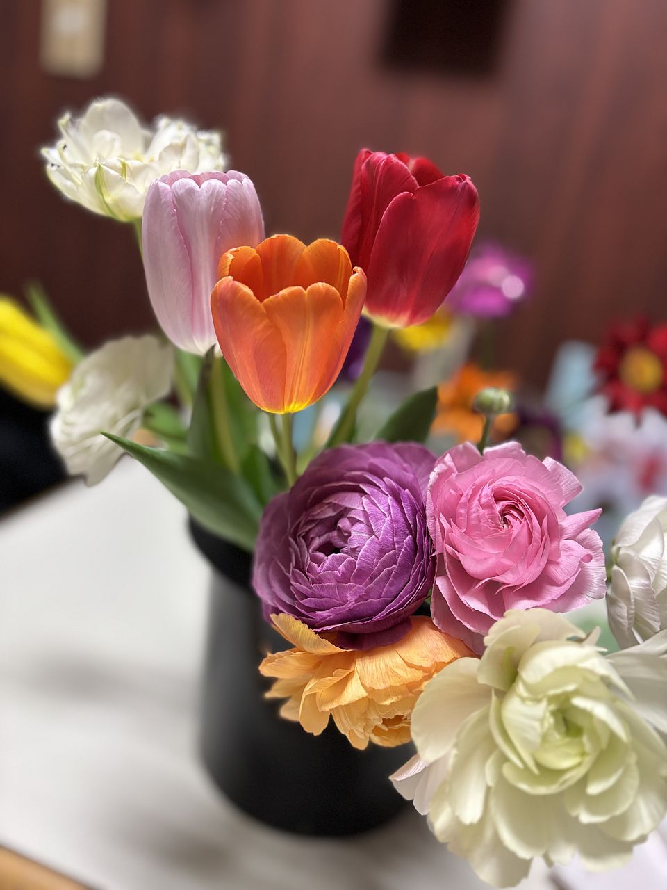 鮮やかな発色が気分を明るくしてくれるチューリップのブーケと、ふんわりと咲き、優雅な存在感のラナンキュラスはお部屋を明るく華やかに✨
