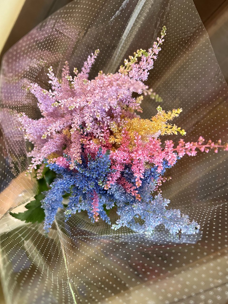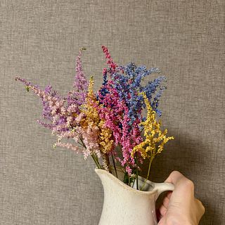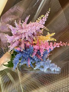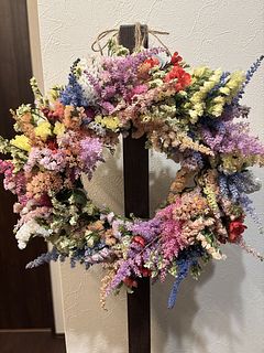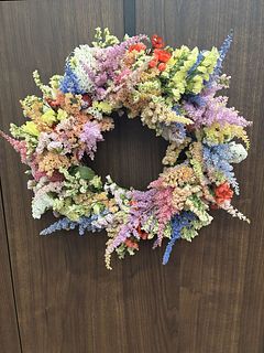 とってもかわいい色とりどりのアスチベル🩷 鮮やかで春らしくとても元気が出るブーケ💐でした。 この色をいかし、スターチスなどを足してリースにしました。 玄関に飾るととても華やかで明るくなります。