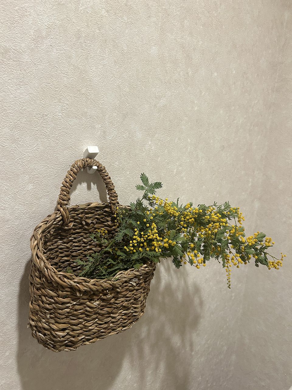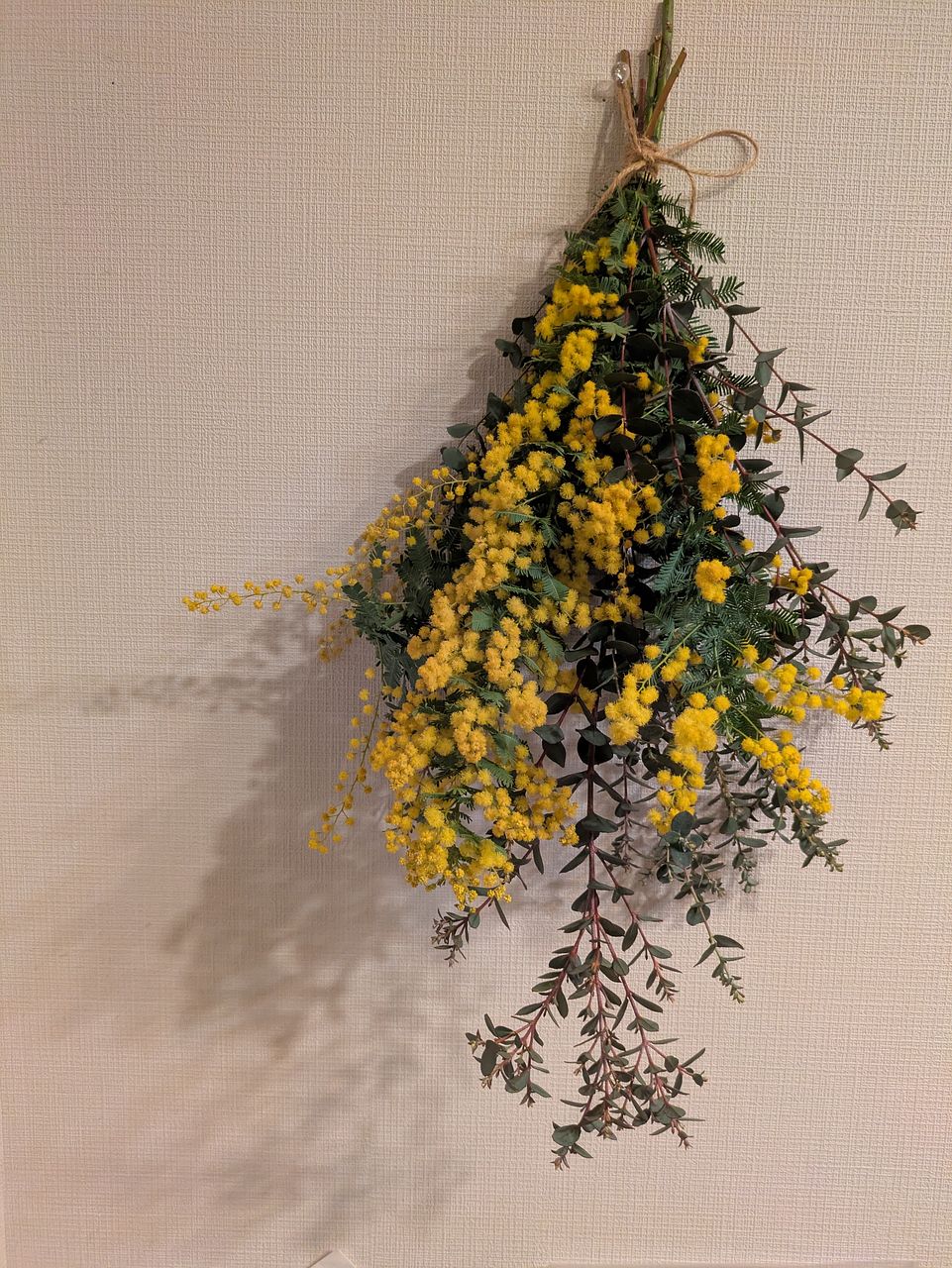 花がポワポワの状態でたくさん届いてとても可愛くて癒されました!2日ほど花瓶に飾っていたのですが、萎む前にスワッグにしてみました。ミモザん飾ると、もうすぐ春だな〜という気分になるのでまた来年も購入したいです!