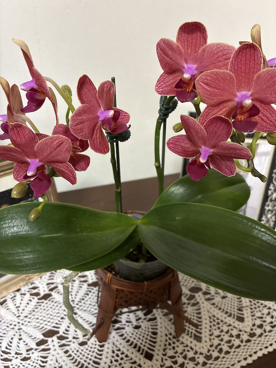 シックで洗練された雰囲気を持ち、上品さの中にモダンな存在感を漂わせます。白やピンクの胡蝶蘭とは一線を画す、個性派の一鉢です。