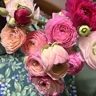 濃淡のバラエティ豊かなピンクのラナンキュラスをたっぷり束ねて。