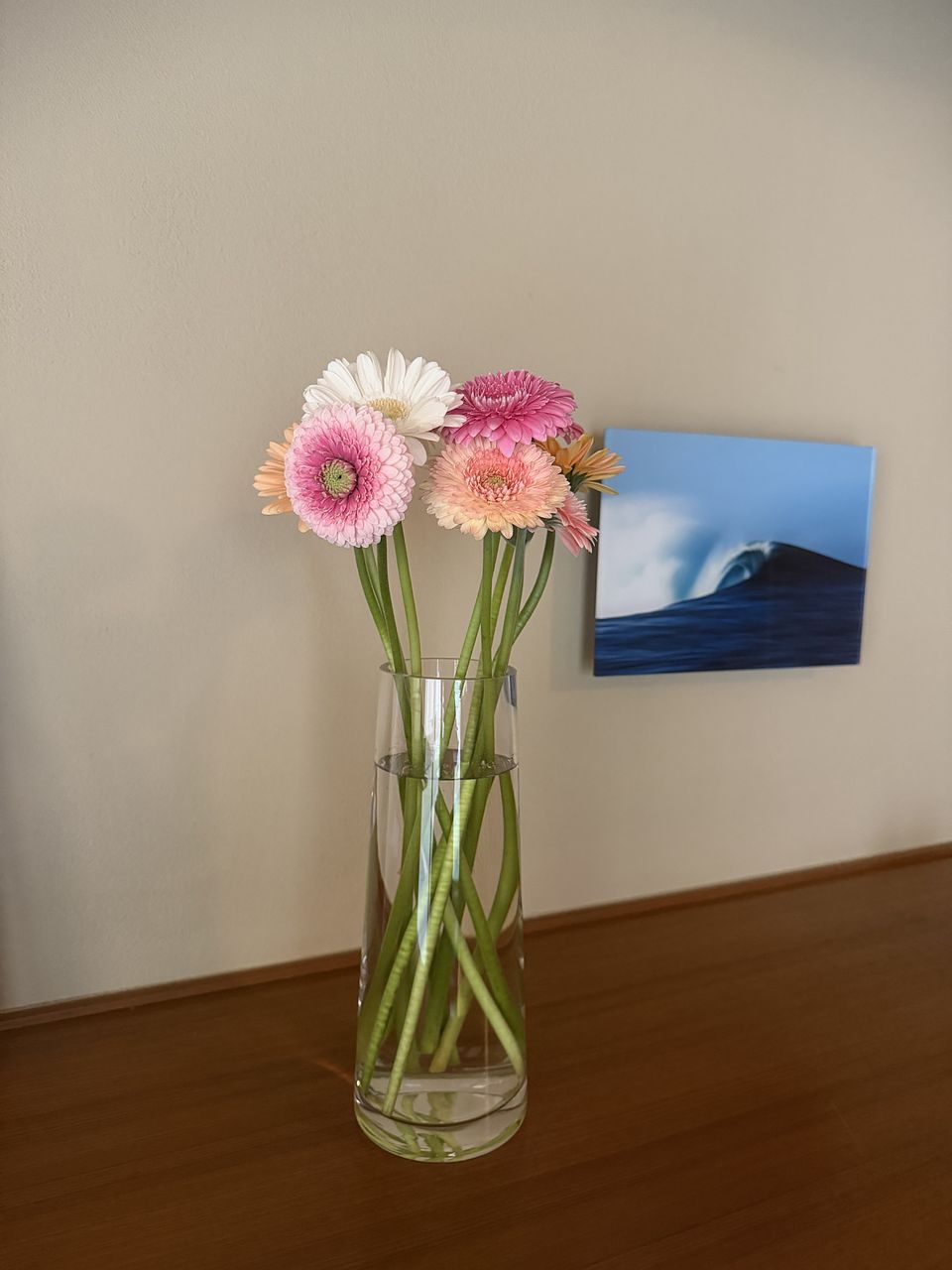 アプリコットピンクやコーラルピンク、ホワイトピンクなどニュアンスカラーのガーベラをギュッと束ねました🍑ころんとした咲き方が最高にキュート。