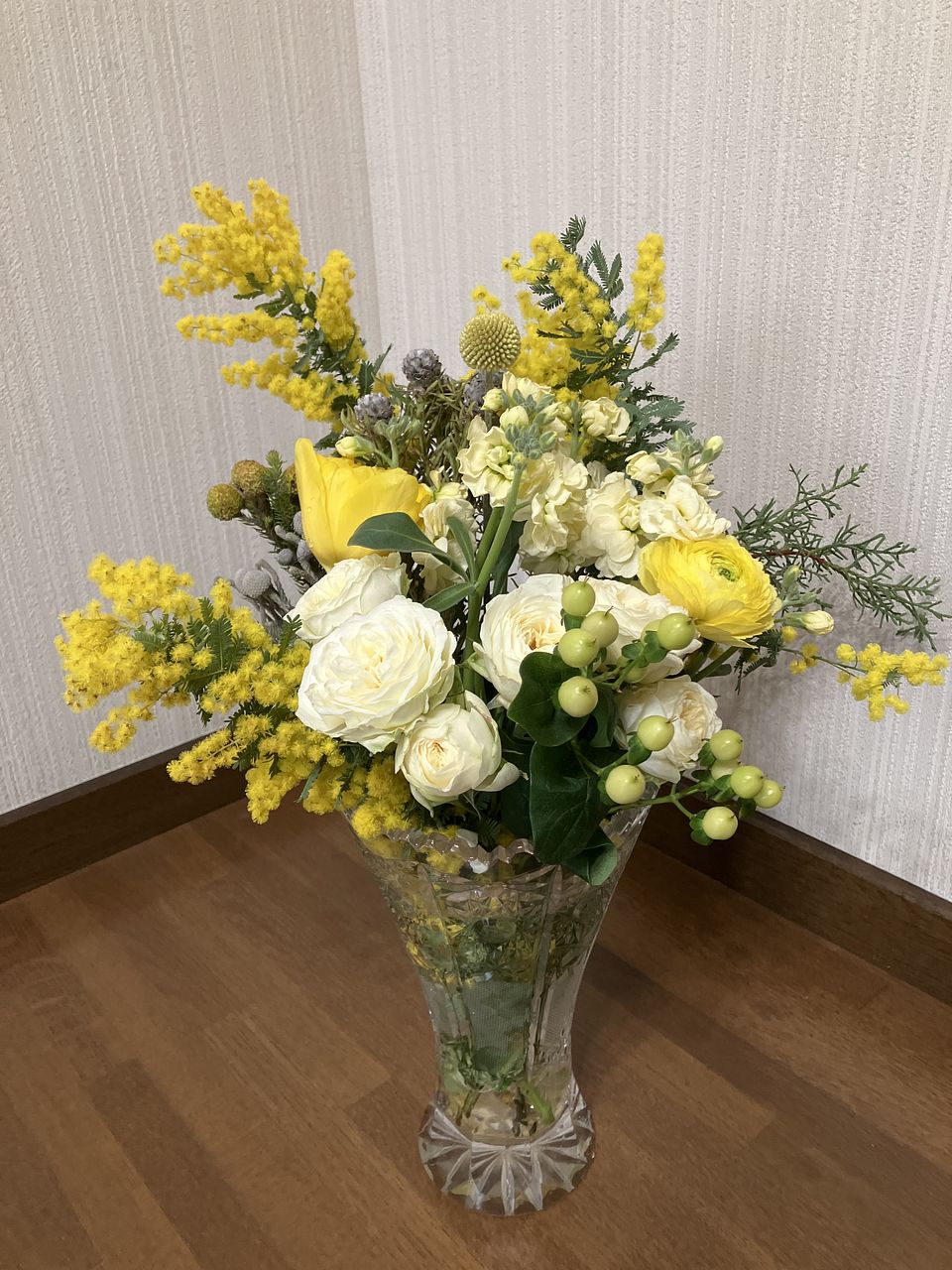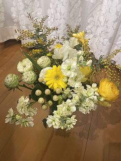ミモザ、スイートピー、カーネーション、ユーカリ バラ チューリップなど様々な黄色と白いお花がとても可愛かったです