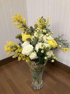全体的によかったですが、 1種類かさましにはいってる感じで全体に合わない花が1種類入っていました それをチョイスした人のセンスが悪いと思います 一種類だけど別の花瓶に入れました 白がかなり多く残念でした 黄色がもっと入ってもよかったと思います やはり見本とは違いますね でも1種類以外は気に入ってます でもその一種類がかなりかさ増しなので影響します またミモザだけで頼みたいです ありがとうございました