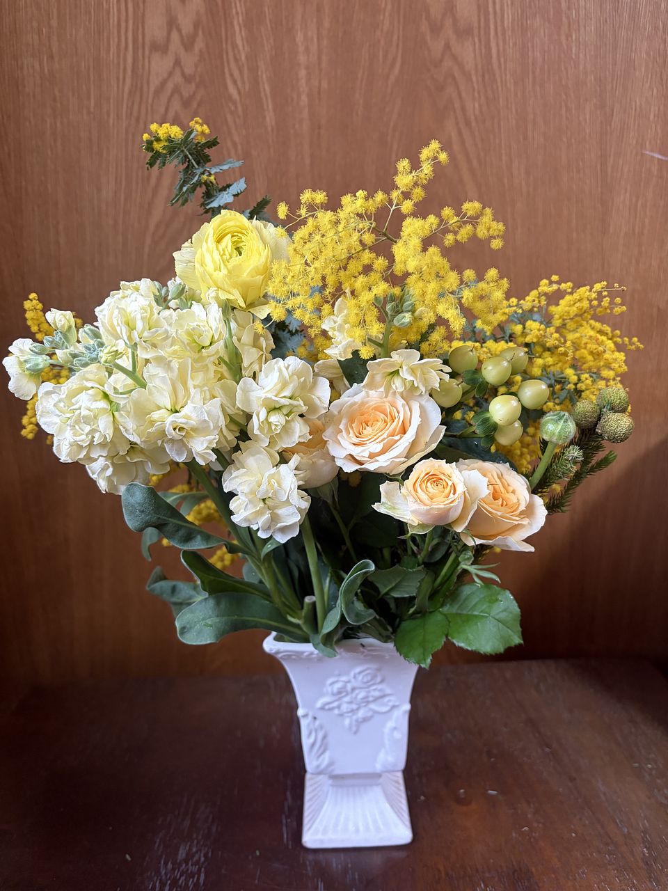 いろいろなお花が入っていてボリュームが有り、とても良い香り!ミモザが可愛い!まさに幸せを運ぶブーケ!