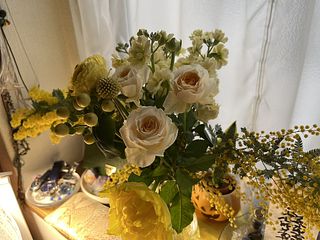 ミモザはフワフワで色々な種類の花たちからいい香りがしています。部屋が明るくなりました。