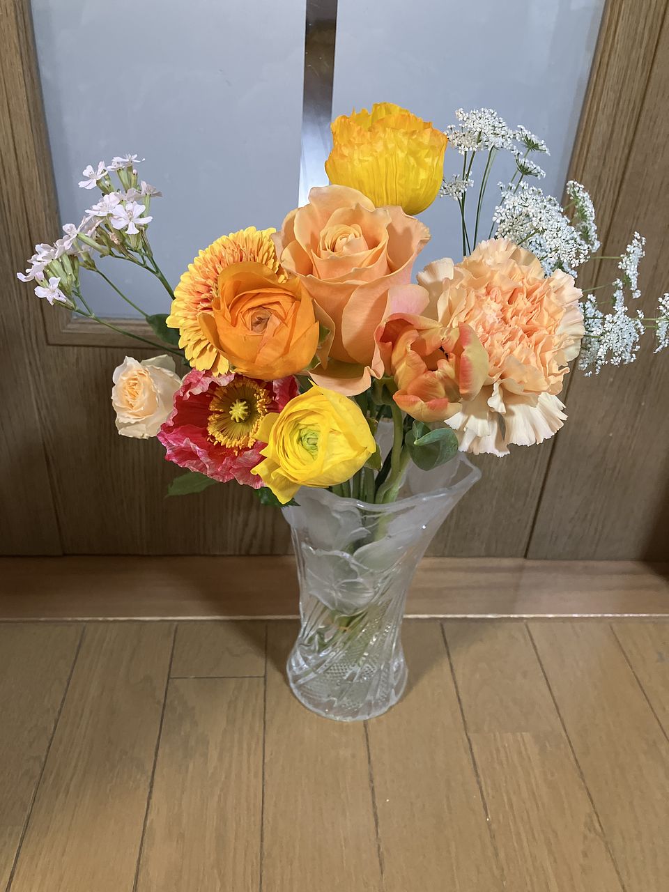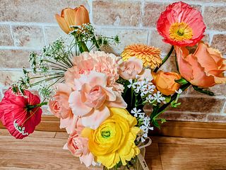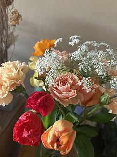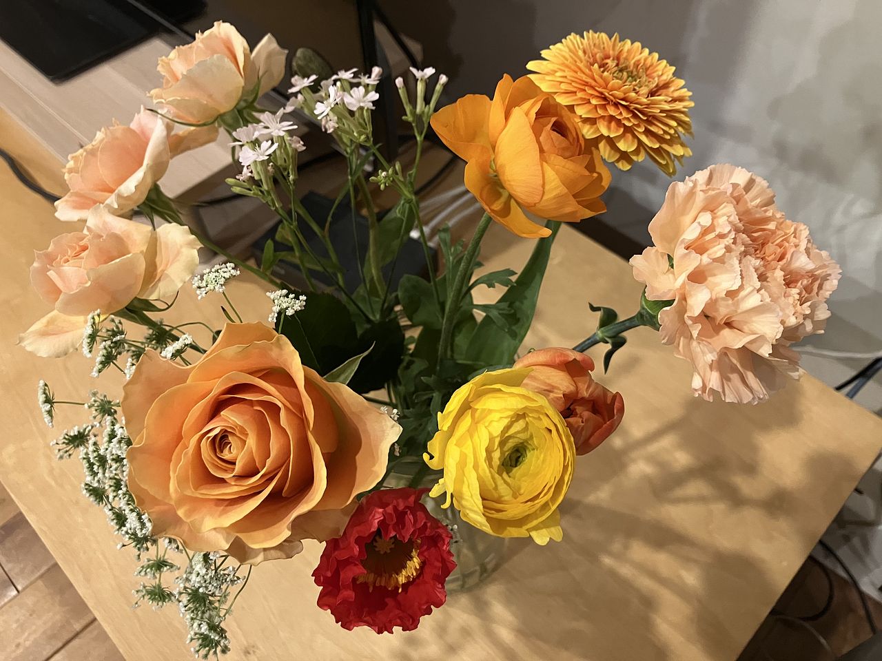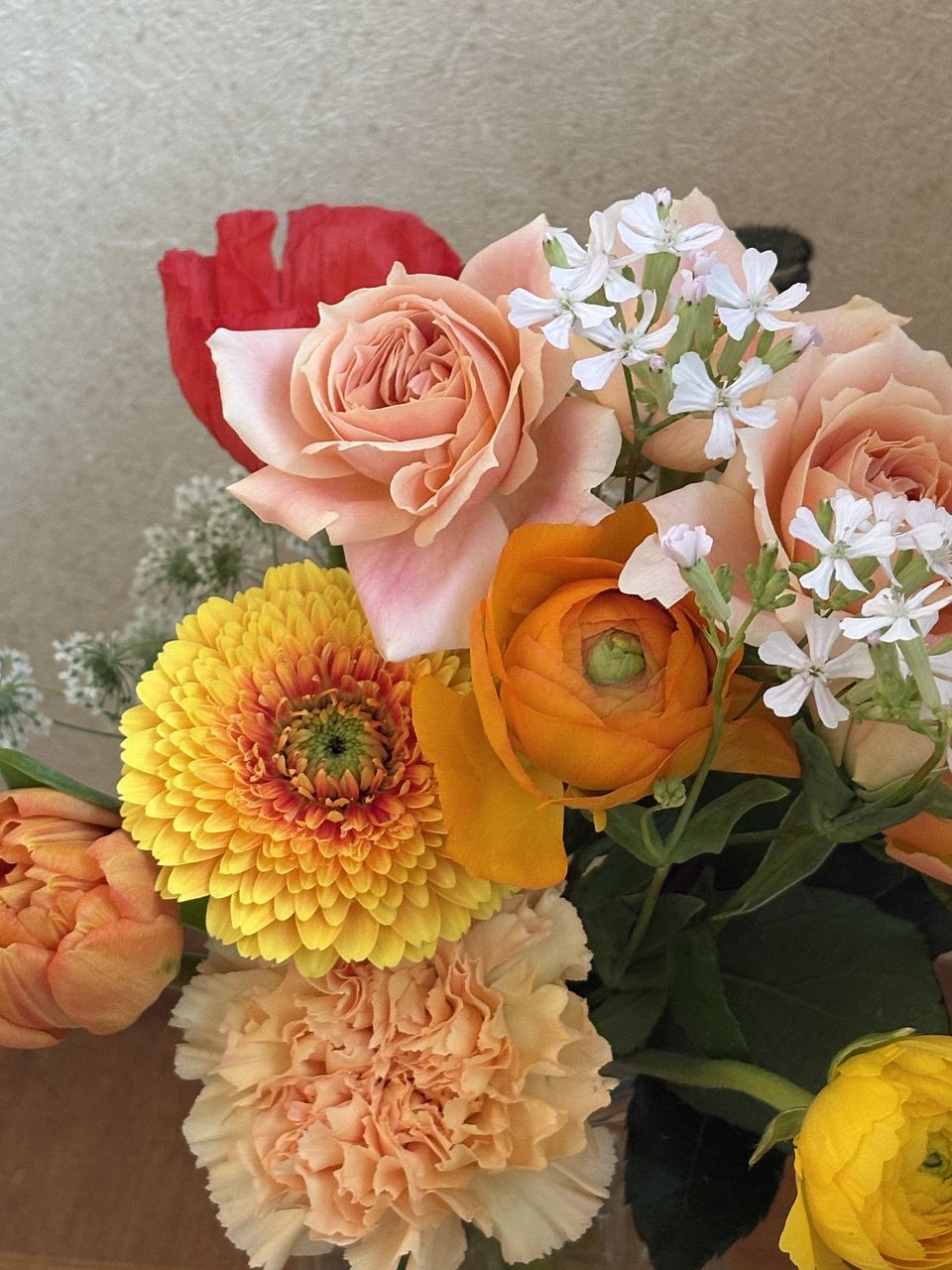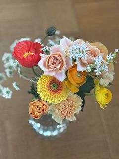 おまかせという事で、バラにガーベラ、カーネーションにポピー、レースフラワーなどボリュームがあって、明るい色合いに、元気をもらえました🥰 ありがとうございました!