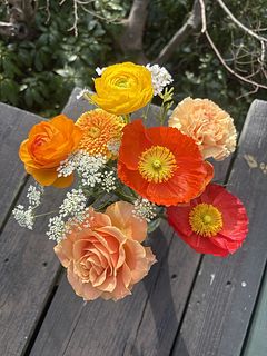 初めの利用で不安でしたがとても可愛いお花が届き満足です。午前中に届いた時には蕾だったポピーとチューリップが午後には元気に咲いてました。ポピー、バラ、ラナンキュラス、チューリップ、ガーベラ、カーネーション、レースフラワー、サクラコマチでした。