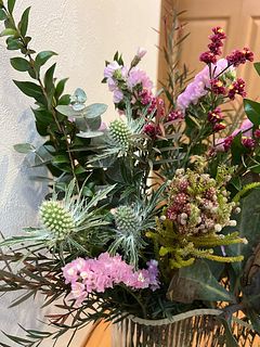最近こちらで購入し過ぎなので、自分にストップをかけないとと思っているのですがプロテアがかっこよくて我慢できませんでした。 近所の花屋ではみかけないし、みなさんのレビューで香りがよいというのも気になっていました。 開封したときの香りがとてもよいです。これはどの花の香りなのだろう? とてもすてきなブーケなので、最終的にはスワッグとして保存したいですが、忙しくて時間がなかったのでとりあえず花瓶へ。ただ突っ込んだだけで、絵になります。 2、3日楽しんでから頑張って加工したいです。