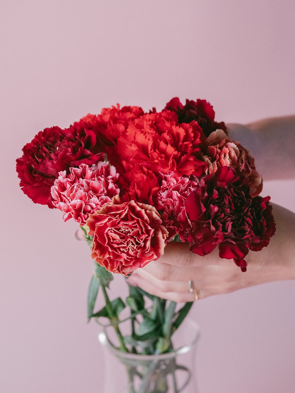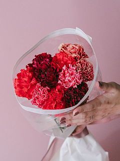 赤いカーネーションの花言葉は「母への愛」。深みのある色や、鮮やかなレッドのコントラストが魅力のブーケです。