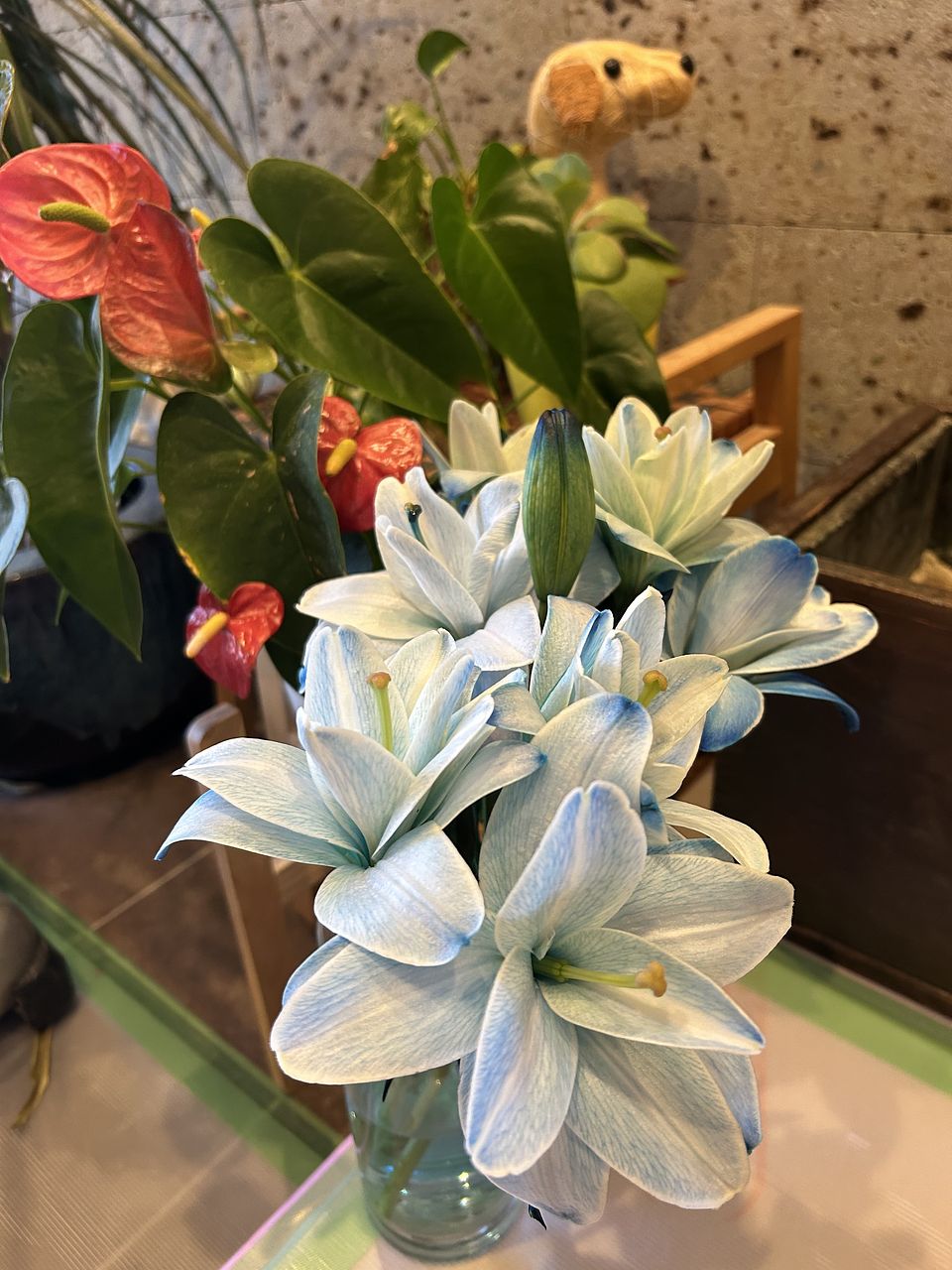 鮮やかなブルーに染まった百合。八重咲きの品種なので、花粉はほとんどありません。花びらはとても繊細で、傷がつきやすいです。気になる場合は、優しく取り除いてください。