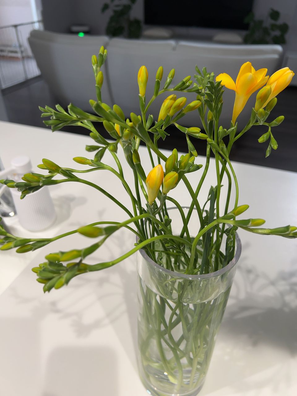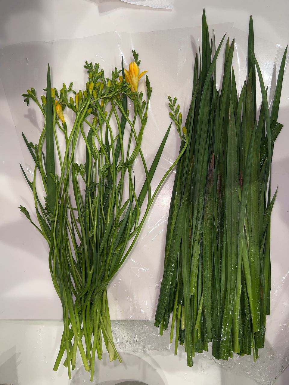 同時に到着したホワイトフリージアミックス(10本)と並べると差は歴然です。