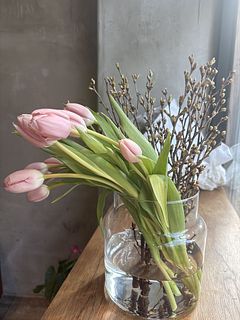 啓翁桜を9〜10本、チューリップを9〜10本、合計18〜20本お届けします。2束まとめて飾っても、それぞれに分けて飾るのもおすすめ。