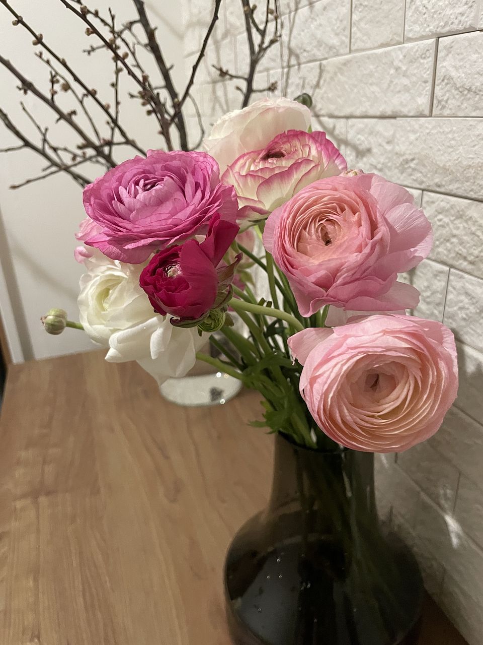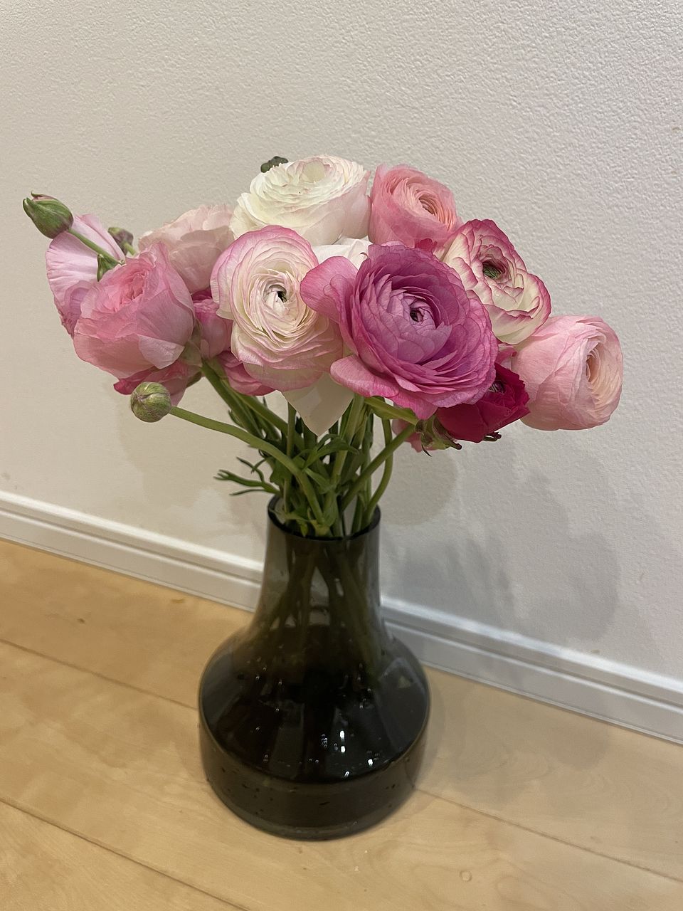 まるくて可愛いラナンキュラス。ピンクのグラデーションが春らしく素敵でした。開花しないつぼみもありましたが、私の生け方が適当なので仕方ない。おおらかに楽しんでいます。