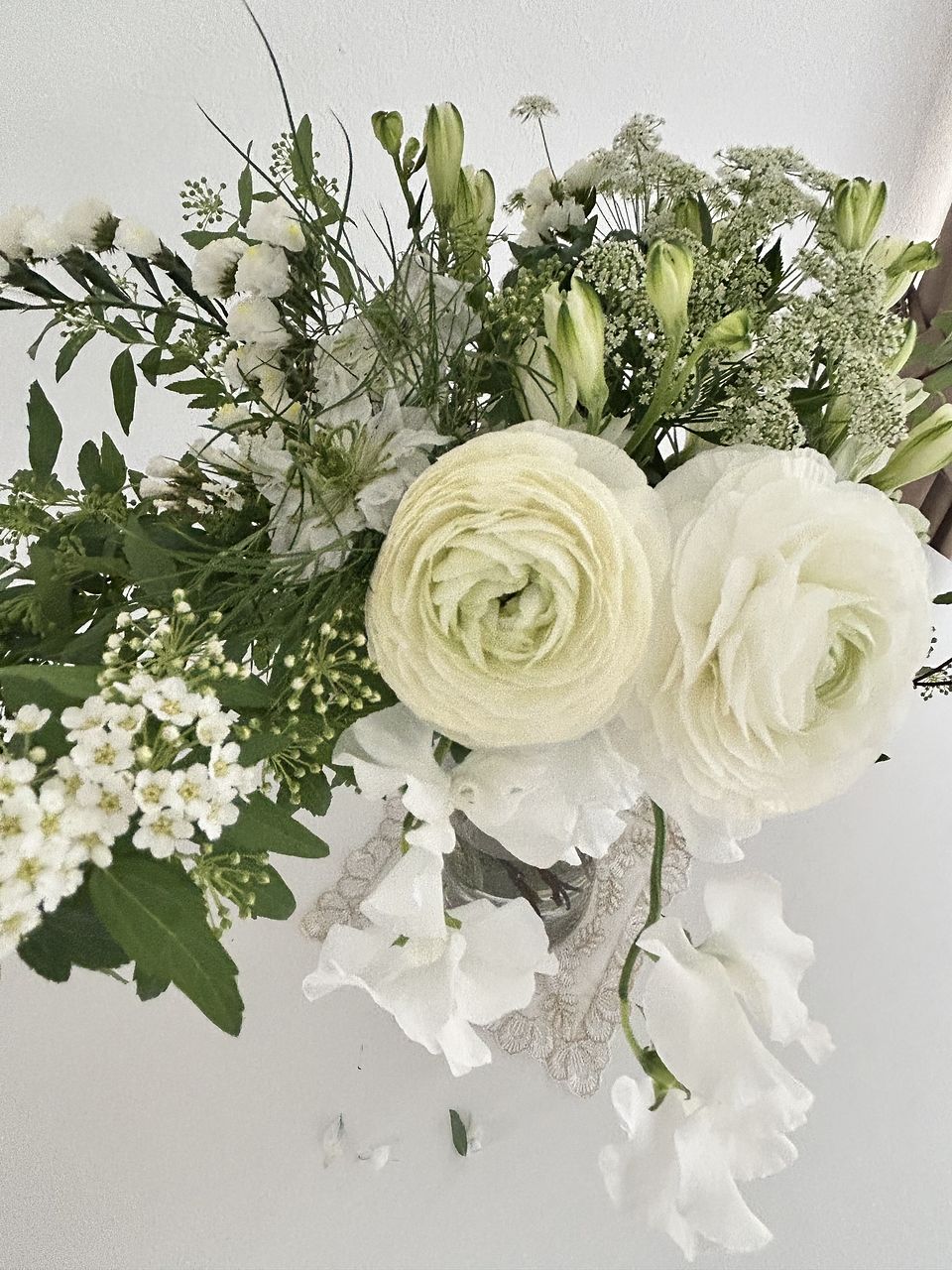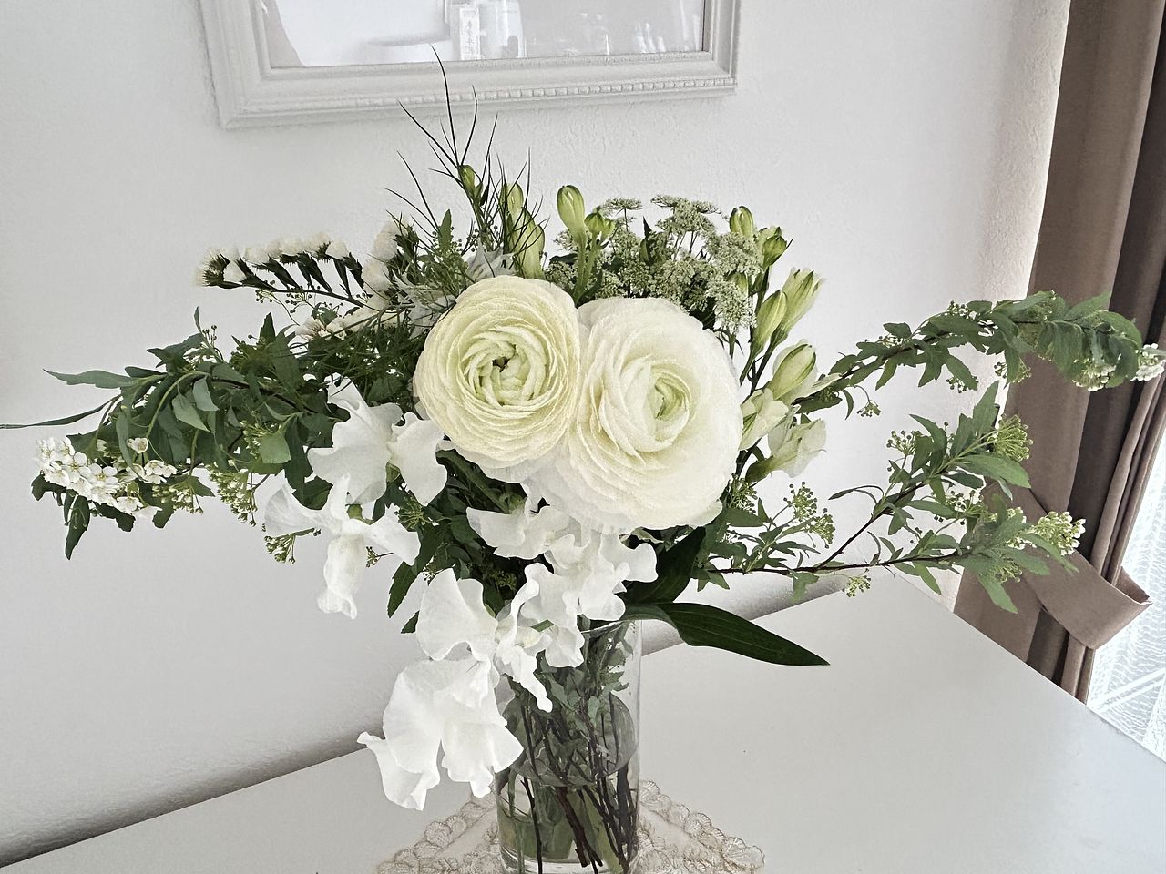 ホワイトカラーのラナンキュラスやスイートピーがまるで白鳥が優雅に舞っているよう🦢