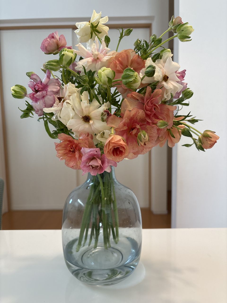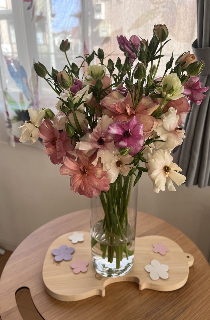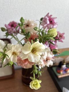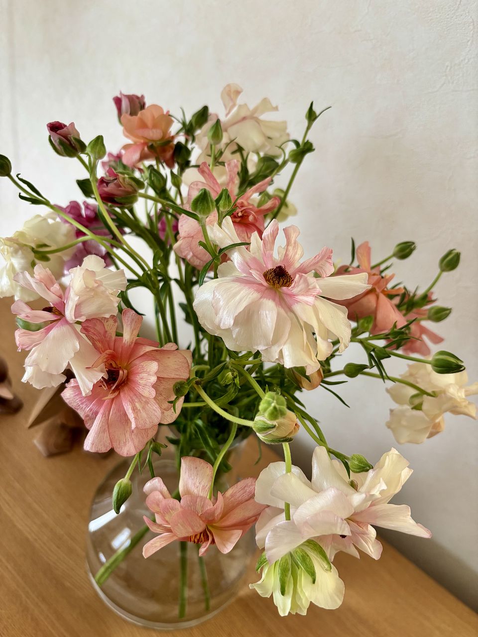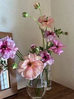 柔らかい色味とツヤ感で、一気に春を感じるお部屋になりました。 開花しているものと蕾のものとのバランスも良かったです。 ラナンキュラスは大好きなお花で、こんな可愛らしいニュアンスの花束は初めてです。 一緒に購入したファゴット(クリア)も、よりお話を引き立ててくれてます。