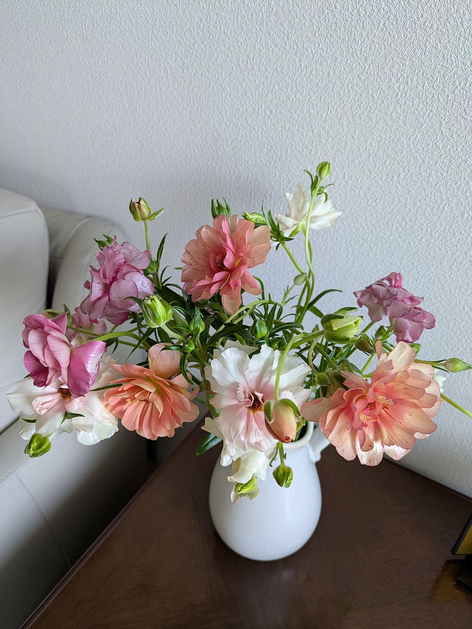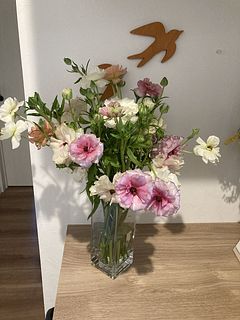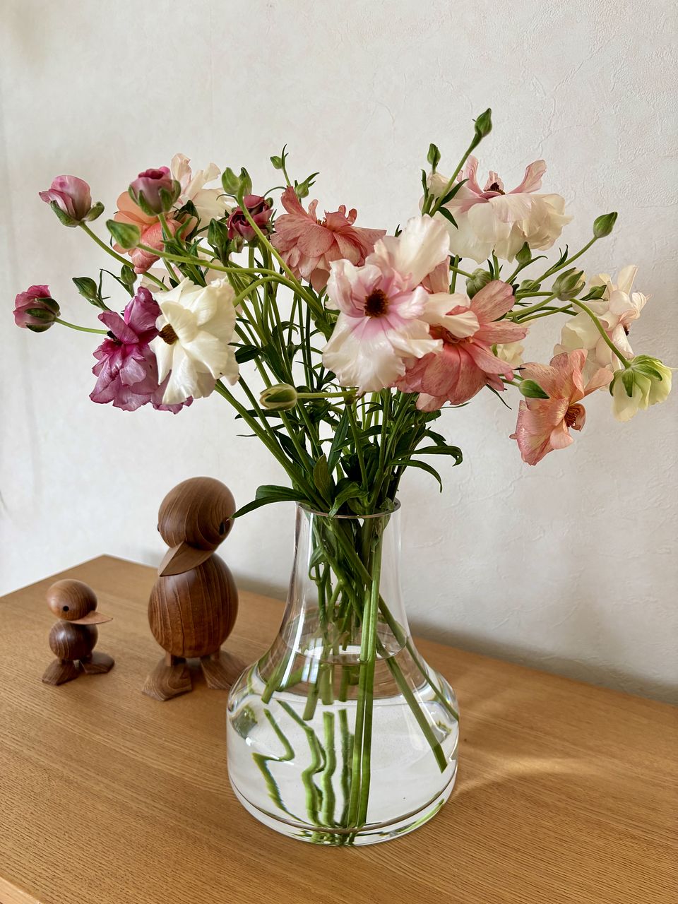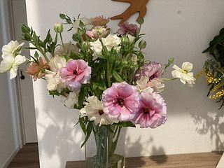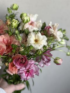 柔らかい色味とツヤ感で、一気に春を感じるお部屋になりました。 開花しているものと蕾のものとのバランスも良かったです。 ラナンキュラスは大好きなお花で、こんな可愛らしいニュアンスの花束は初めてです。 一緒に購入したファゴット(クリア)も、よりお話を引き立ててくれてます。