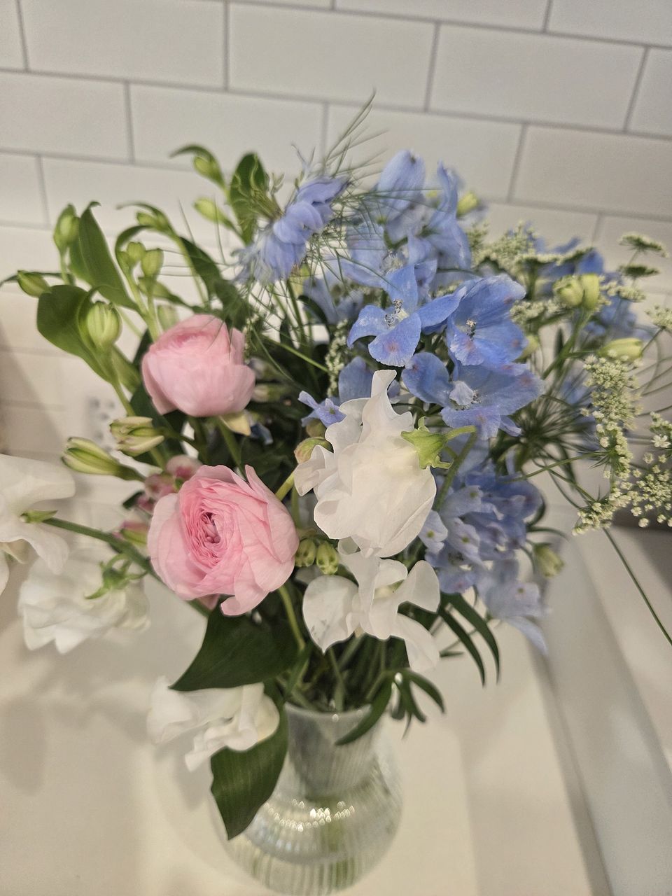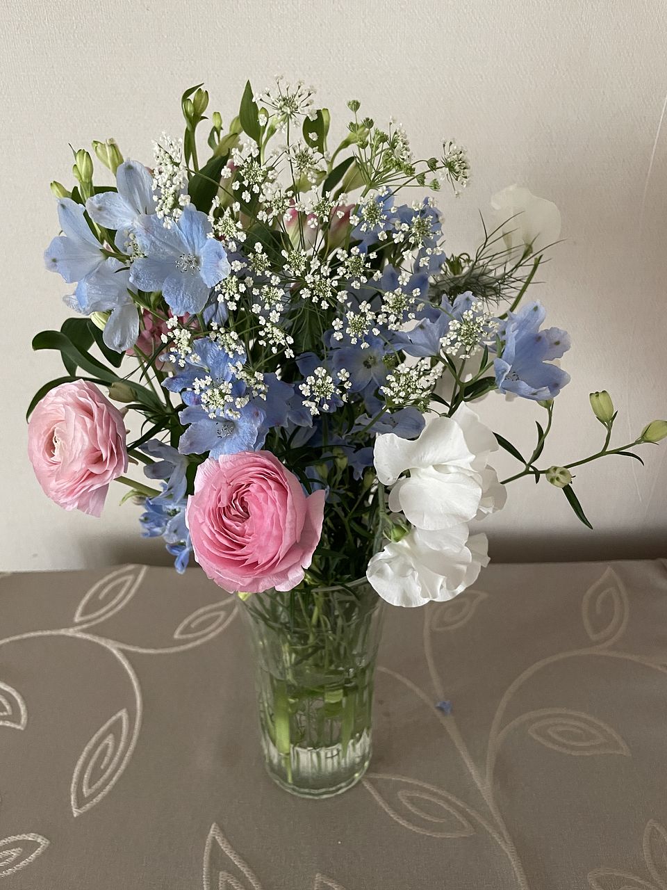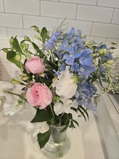 とても素敵なブーケでした! 白、ブルー、ピンクの花たちが華やかで爽やか! ありがとうございます!