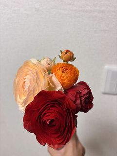 写真を見て変わった柄や咲き方の品種が1〜2本くらい入るのかなと思っていたのですが、いたってノーマルなものが4色入っていて、期待していたより普通のブーケでした。ただし、10本と商品ページには書いていたのですが 、咲いているものが11本と蕾が3本も入っていて、元々がお手頃なのにずいぶんサービスしていただいてるんだなあとありがたく思いました。首が垂れ下がっていて直らないものが1本、心配なものが2本あり、特にその1本は撮影後紙を巻いて補正中です。