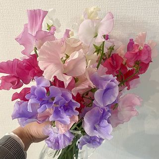 色とりどりのスイートピーが届きます。色味はランダムです。