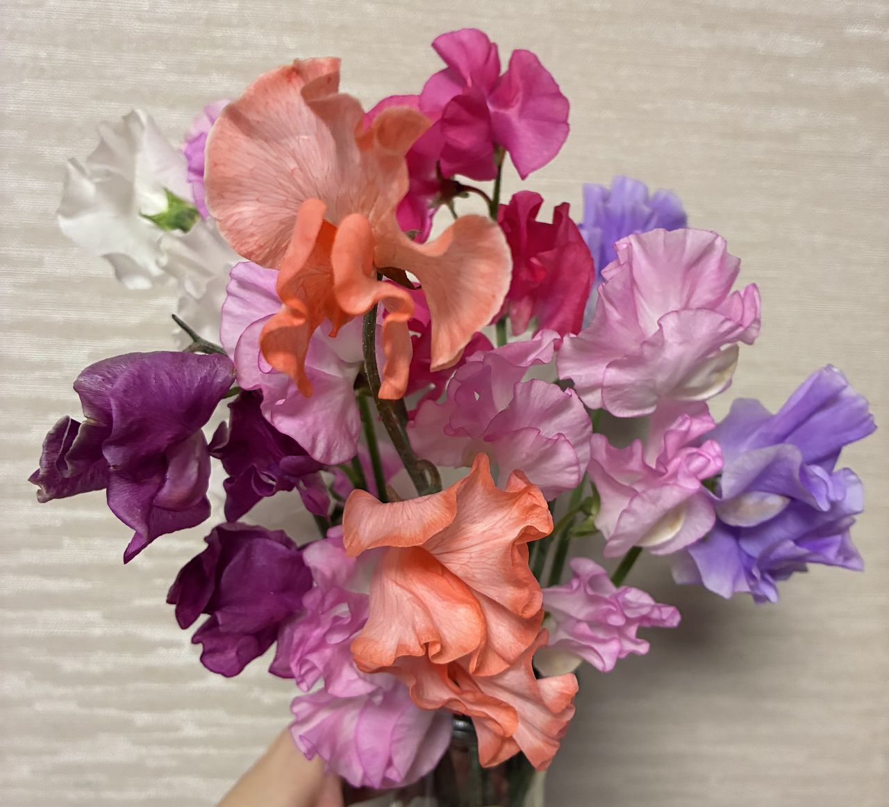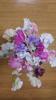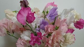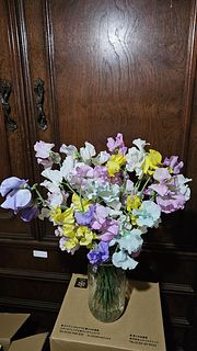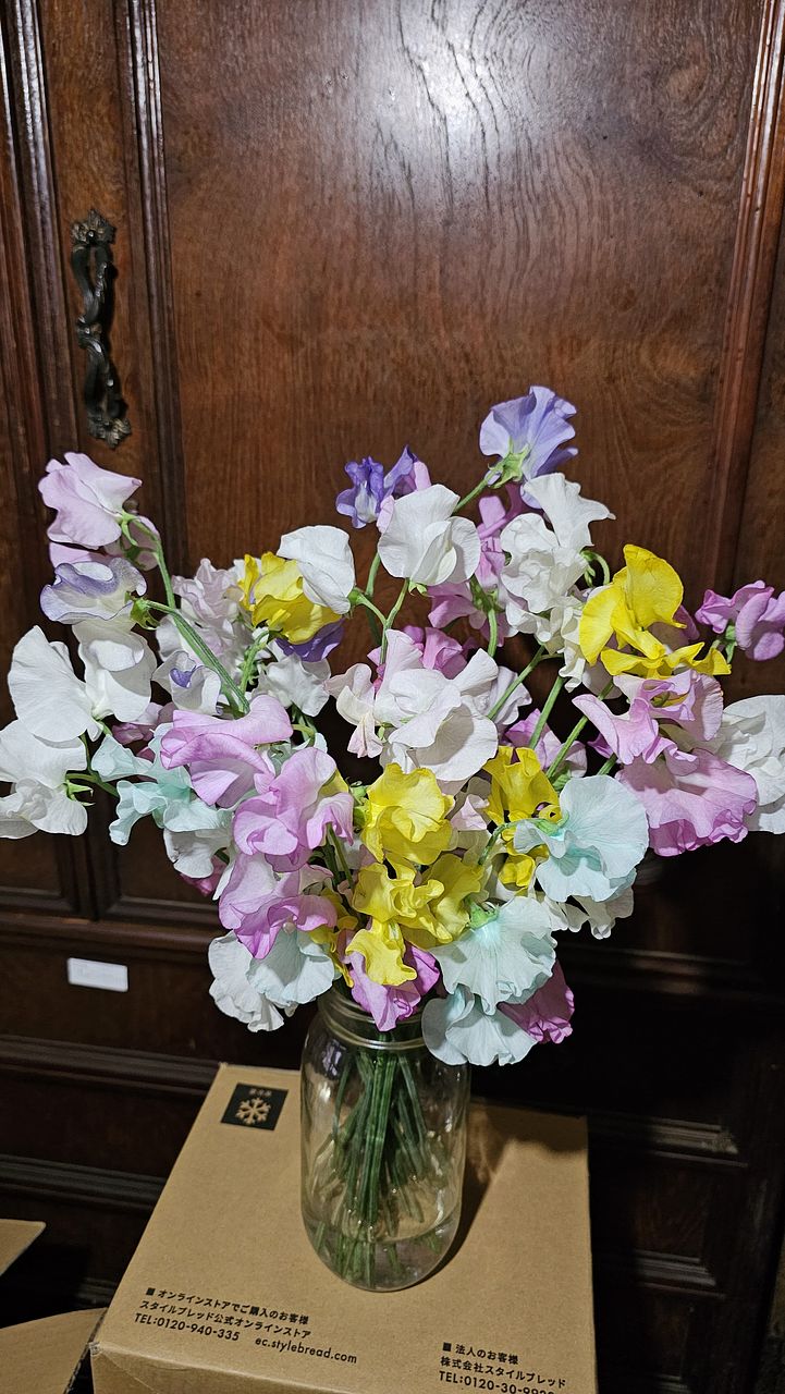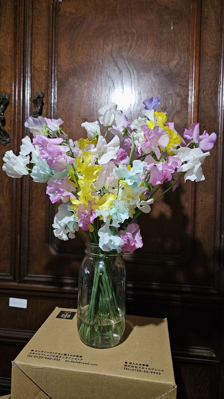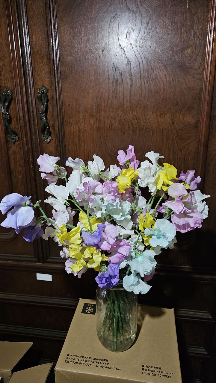 届いたフリージアの色は、冬から春へと変わる色のパステルカラーの組み合わせに黄色が、アクセントに成っていました。届いてからは、パステルカラーと濃いめの色に別けて生けて居たのですが、全部一緒に生けたら良いかもと水替えの時に生け変えました。近くのフラワーショップ(ショピングモール内)のスイトピー(5~6本)の花茎(背丈)は、こちらのFLOWERのスイトピーの花茎丈より、短かったです。(私の希望としては、見本の写真の様なワインレドの色が、欲しかったですが、フローリストさんが、選んでくれる色合わせも、また、違って、良いです🥰