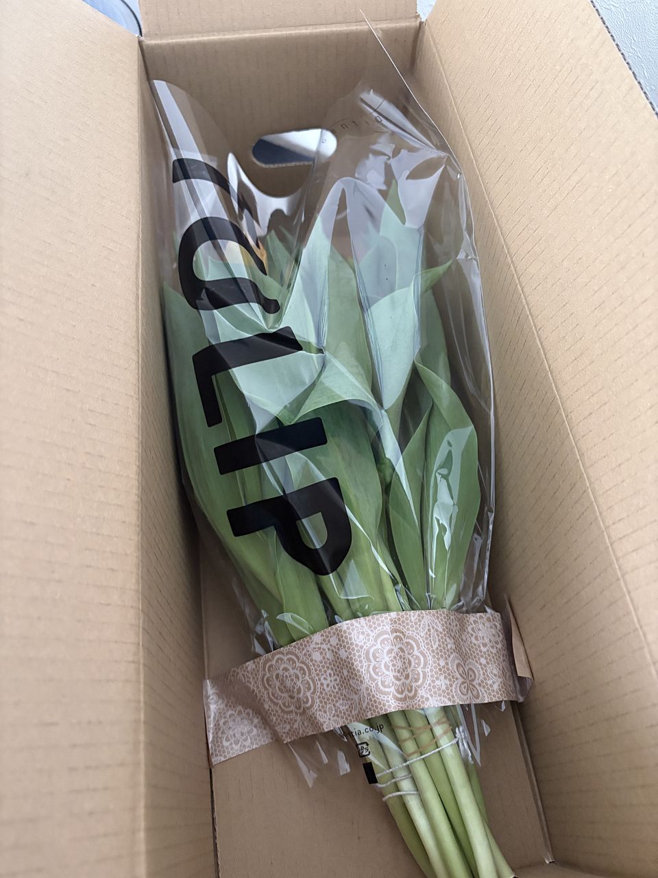 産直のチューリップはつぼみの状態でお届けすることも。水揚げするとするとふっくら色づき、大きくなりますのでご安心ください。