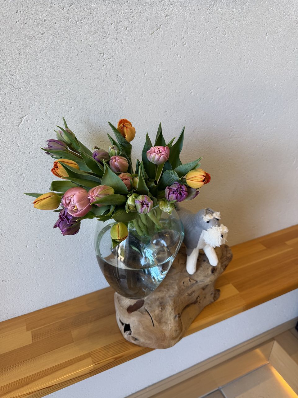 今回は3品種ミックスでお届けします。どんなチューリップが届くかは、箱を開けるまでのお楽しみ。長く楽しめるよう、硬いつぼみの状態でお届けしていることも。水揚げするとふっくら色づきますのでご安心ください。
