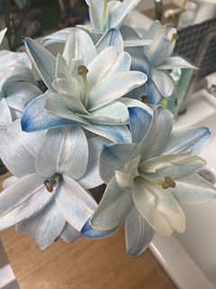 夏に蕾のまま枯れてしまったリリーのリベンジ!水揚げして2日目から一斉に開きました。とても綺麗です✨供え花としていつも利用させて頂いてます。寒色系のお花が好きなので冬場にも継続して登場する事を願っています。前回購入した染めのブルーのマムもとても長持ちで綺麗でした。