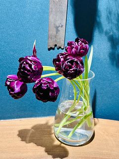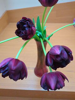 色はもちろん、花の大きさやフォルムが普通のチューリップとは違っていてとても可愛いです。 『ブラックヒーロー』というネーミングから、もっとシュッとしたクールな雰囲気をイメージしていましたが可愛らしい感じです。 この花に合う花器がなくどうしても下を向いてしまいます。生け方が難しいです。