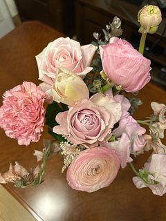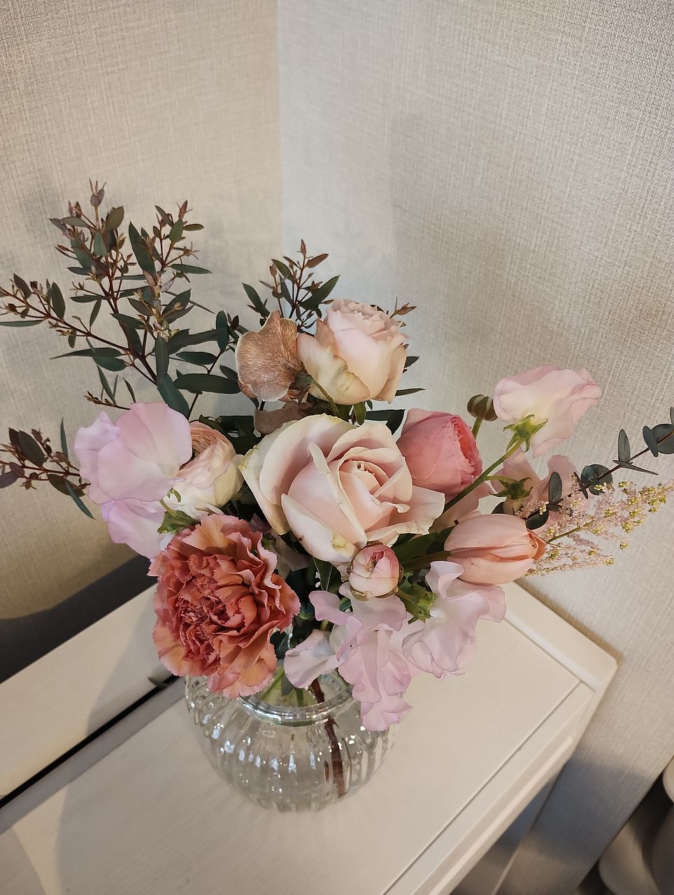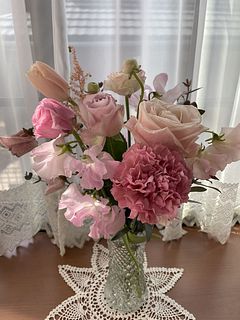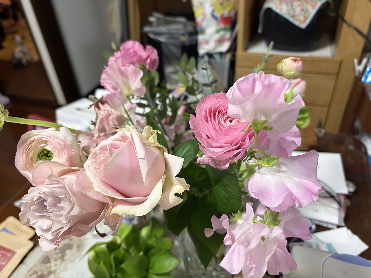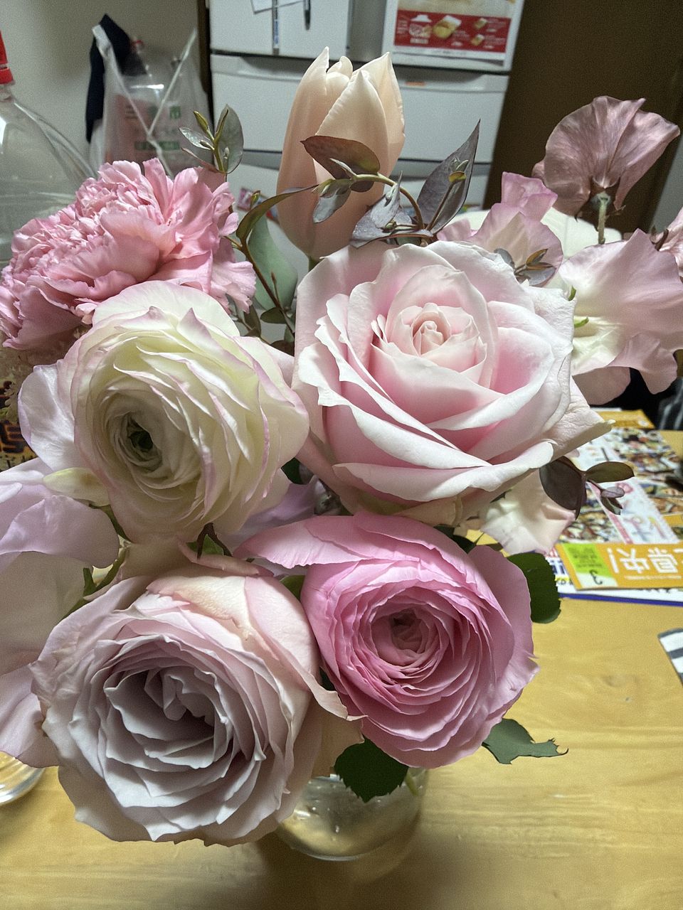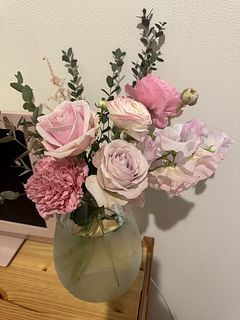とても可愛いピンク色の沢山の品種のお花が入っていて、嬉しくなりました! また見た目だけでなく、スイートピーやバラの香りが良くて癒されています。 素敵なブーケを届けていただきありがとうございました。