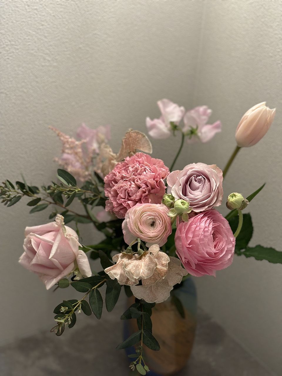 優しいピンクとユーカリがとても似合って 良かったです。 特にラナンキュラスがすごく可愛いです🩷