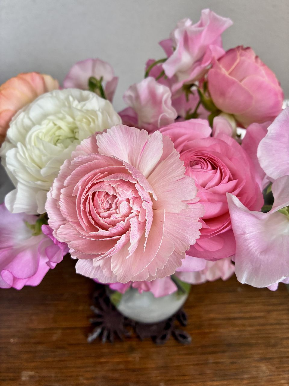 スイートピーの軽やかな花びらと、ラナンキュラスの幾重にも重なる花姿を束ねた、やさしいピンク色のブーケ🌸