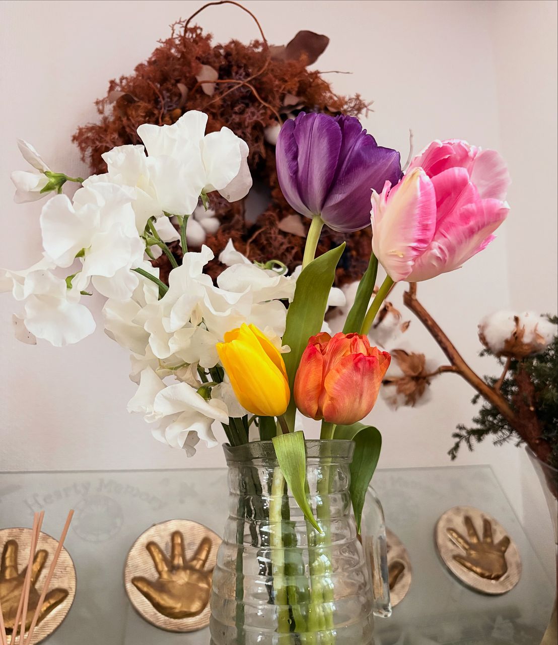 チューリップたちと雪のように真っ白なスイートピーとの組み合わせが魅力のブーケです。