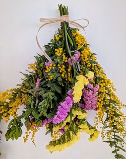 配送の方が少し箱が凹んでいるということで中身を確認後受け取りました。 ボリュームは写真通りで新鮮なお花が届きました。 マトリカリアはそのまま花瓶に飾り、ミモザは直ぐに蒸れてしまうので家にあったスターチスと一緒にスワッグにして飾りました。春らしくなりました。