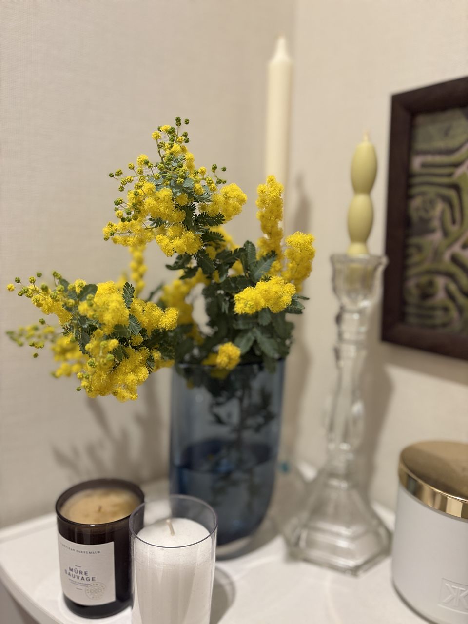 フレッシュならではの、ぷっくりとしたミモザと愛らしいマトリカリアが春を呼び込んでくれたよう。ぱっと部屋が明るくなりました。たっぷりのボリュームがあり、4箇所にわけて飾りました。いずれも日が経つと花の部分が小さくなりますが、水を早めに変えたり、ドライフラワーのように楽しんだりしました。