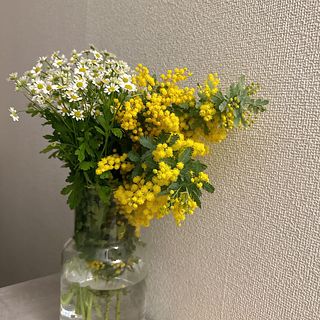 華やかなミモザとマトリカリアの可憐な花束 ボリュームたっぷりで我が家に春がやってきた感じです。るんるん気分で活けました。ありがとうございます。
